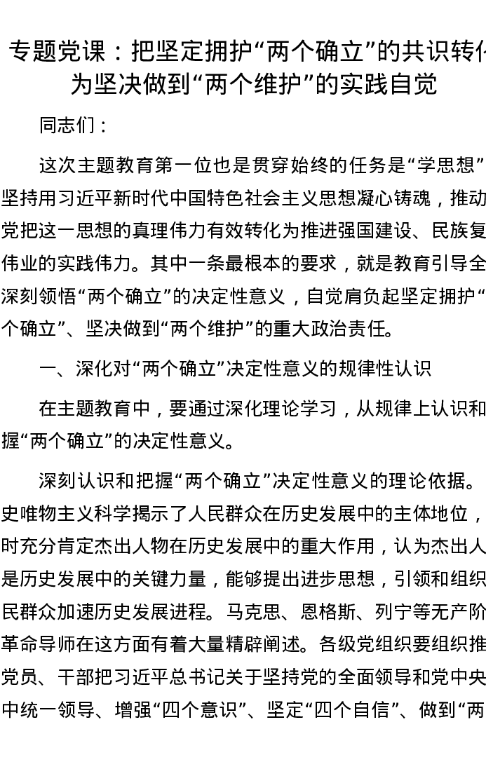专题党课:把坚定拥护“两个确立”的共识 转化为坚决做到“两个维护”的实践自觉