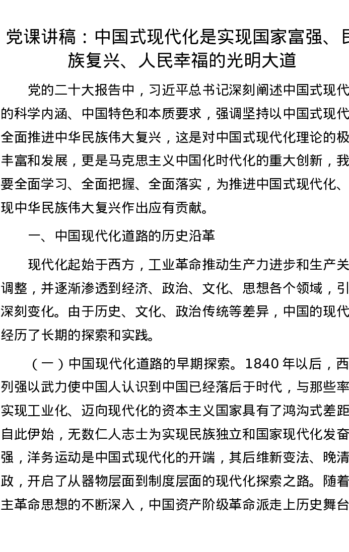 党课讲稿:中国式现代化是实现国家富强、 民族复兴、人民幸福的光明大道