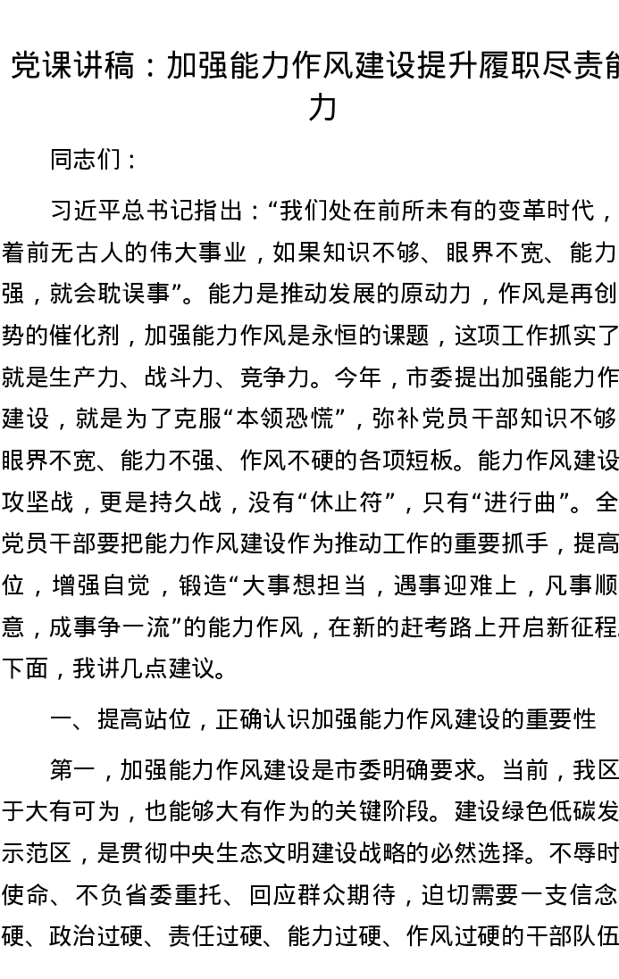 党课讲稿:加强能力作风建设 提升履职尽责能力
