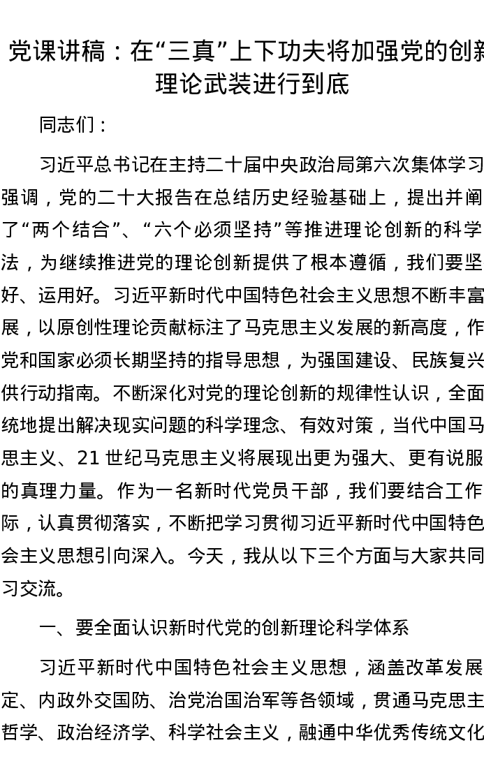党课讲稿:在“三真”上下功夫 将加强党的创新理论武装进行到底