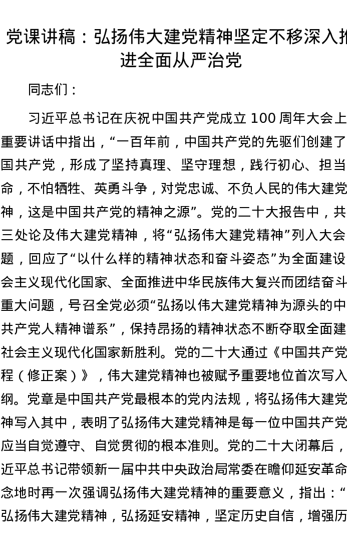 党课讲稿:弘扬伟大建党精神 坚定不移深入推进全面从严治党