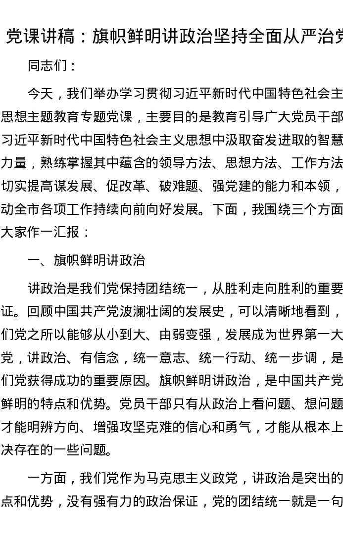 党课讲稿:旗帜鲜明讲政治 坚持全面从严治党