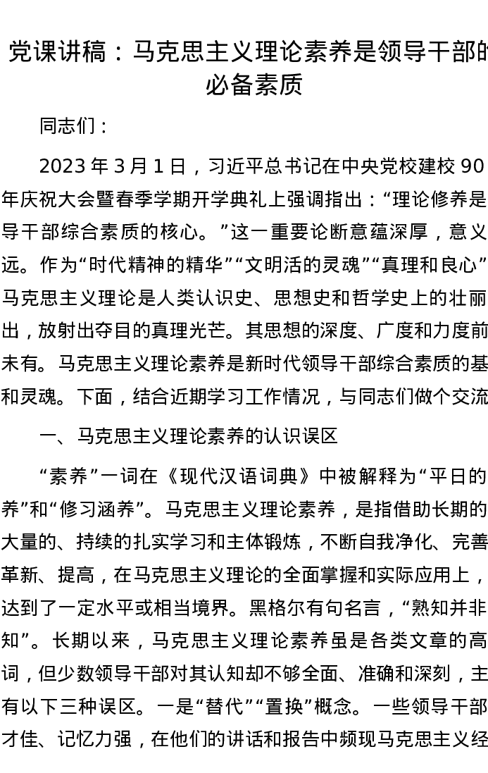党课讲稿:马克思主义理论素养是领导干部的必备素质