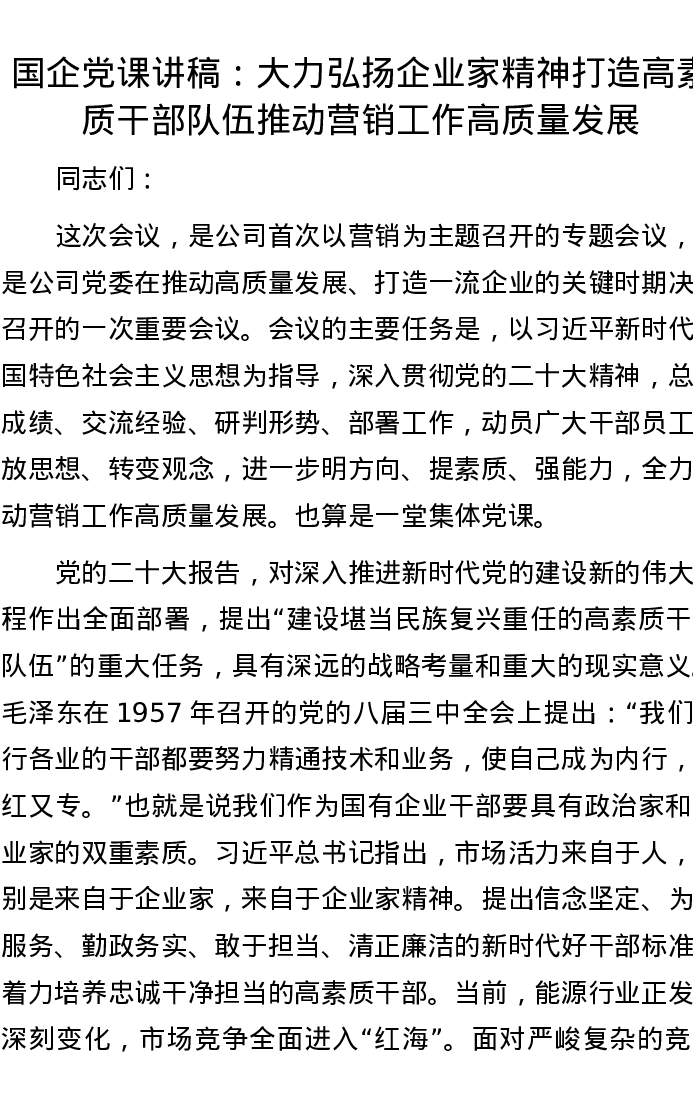 国企党课讲稿:大力弘扬企业家精神 打造高素质干部队伍 推动营销工作高质量发展