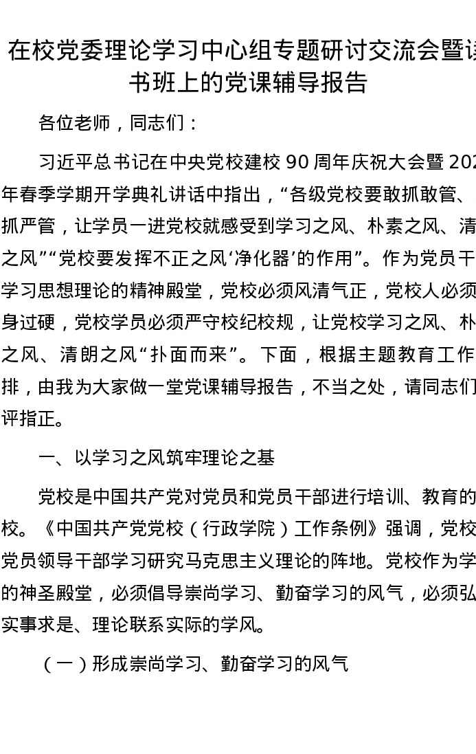在校党委理论学习中心组专题研讨交流会暨读书班上的党课辅导报告