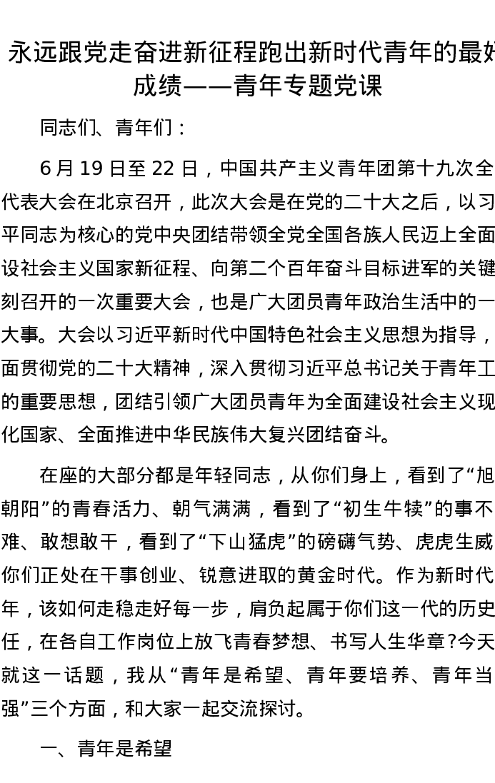 永远跟党走 奋进新征程跑出新时代青年的最好成绩——青年专题党课