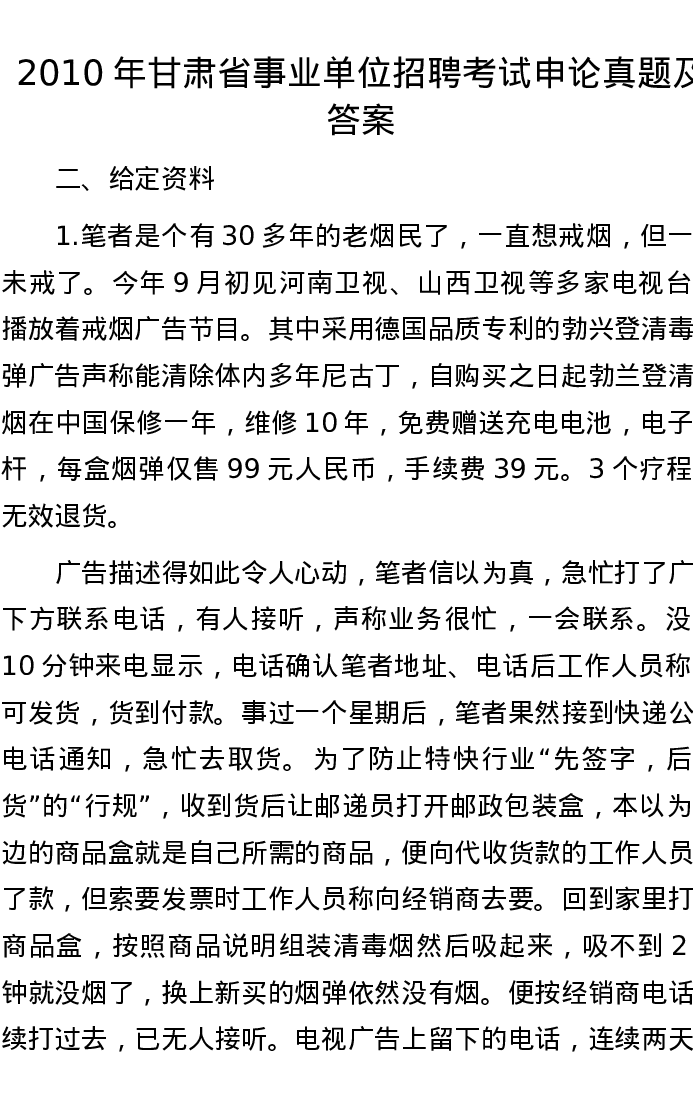 2010年甘肃省事业单位招聘考试申论真题及答案