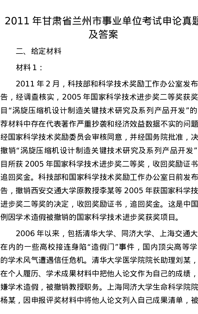 2011年甘肃省兰州市事业单位考试申论真题及答案