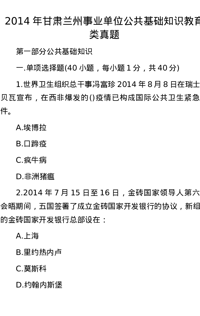 2014年甘肃兰州事业单位公共基础知识教育类真题