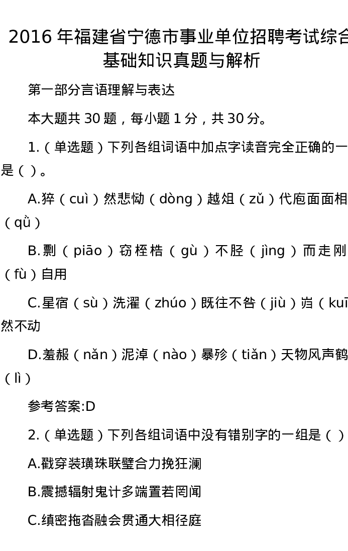 2016年福建省宁德市事业单位招聘考试综合基础知识真题与解析