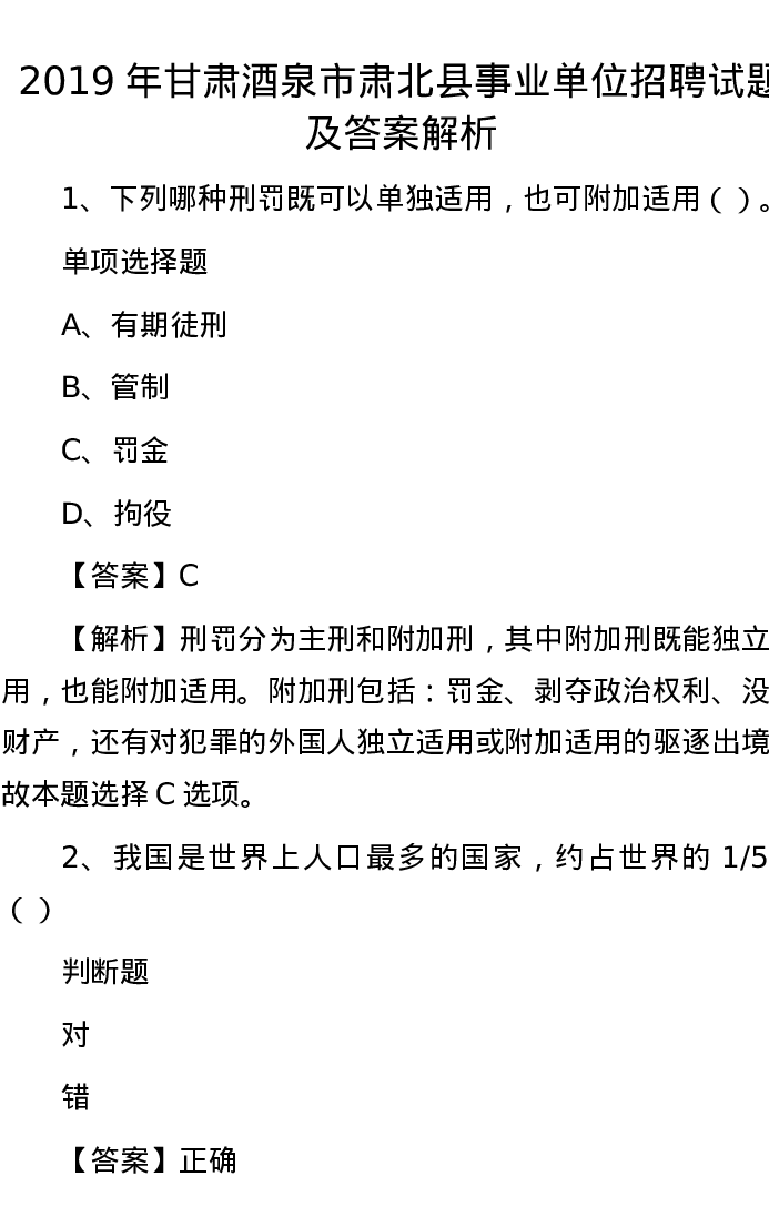 2019年甘肃酒泉市肃北县事业单位招聘试题及答案解析
