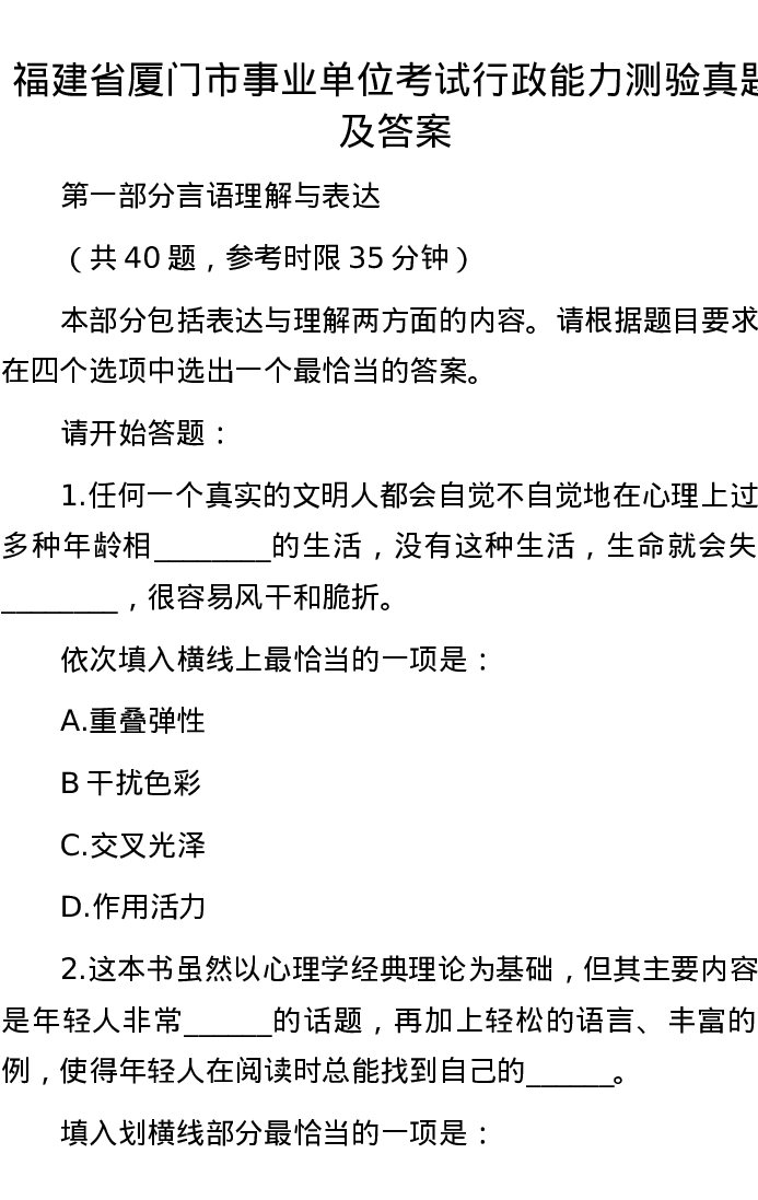 福建省厦门市事业单位考试行政能力测验真题及答案