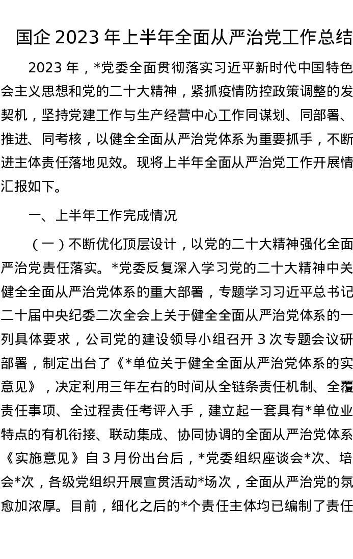 国企2023年上半年全面从严治党工作总结