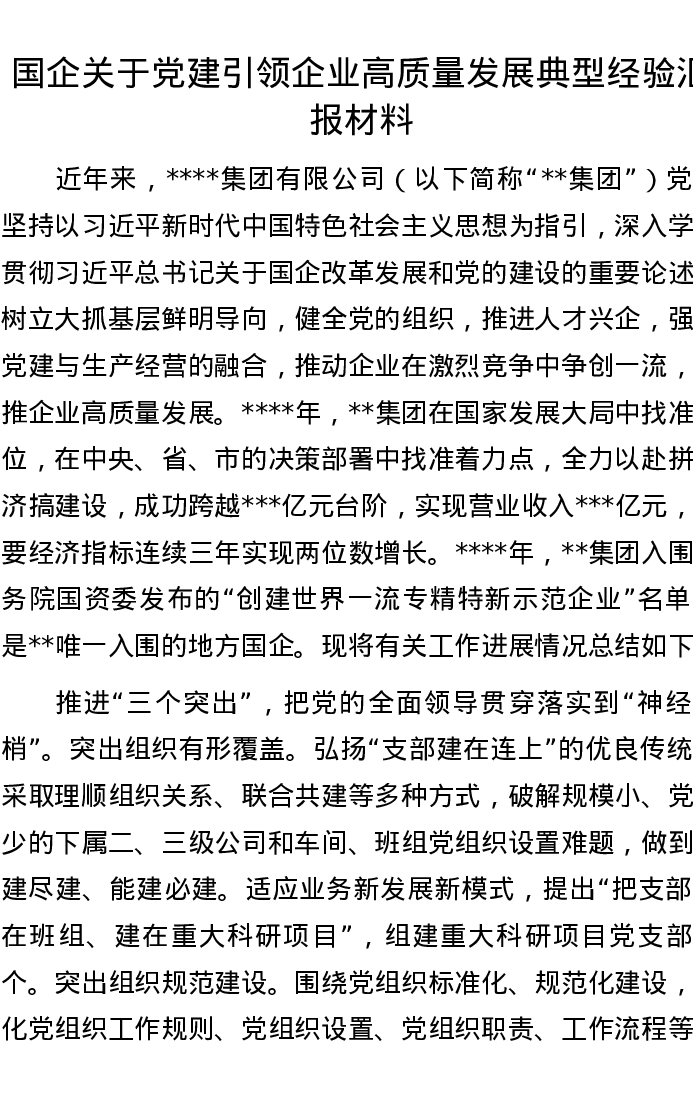 国企关于党建引领企业高质量发展典型经验汇报材料