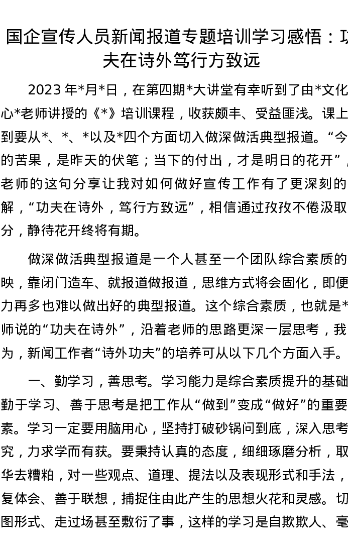 国企宣传人员新闻报道专题培训学习感悟:功夫在诗外 笃行方致远