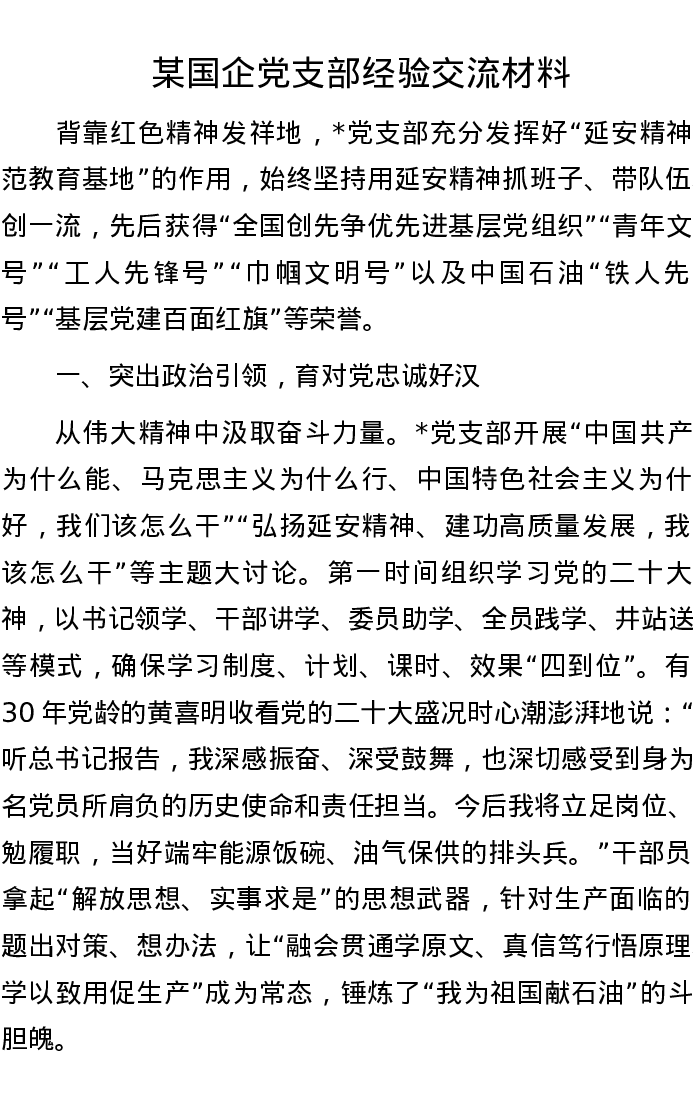 某国企党支部经验交流材料