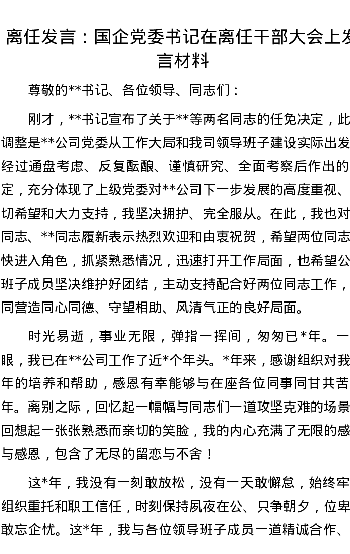 离任发言:国企党委书记在离任干部大会上发言材料