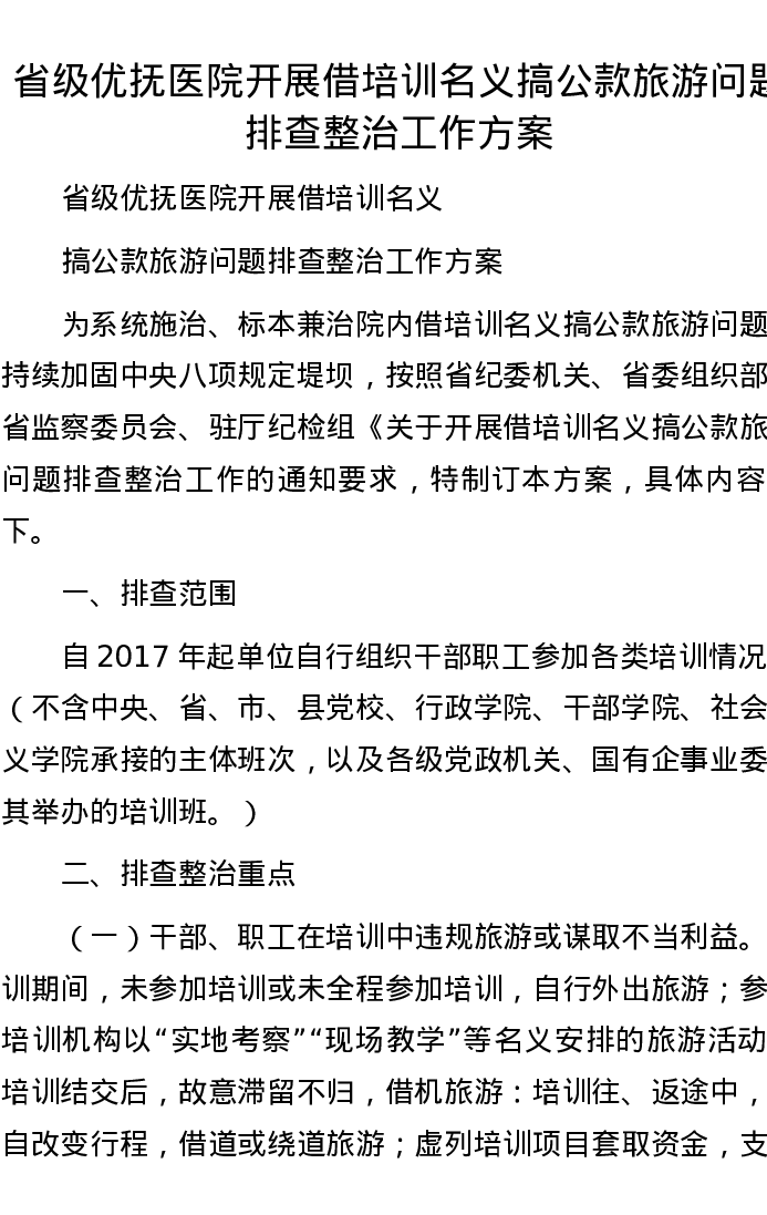 省级优抚医院开展借培训名义搞公款旅游问题排查整治工作方案