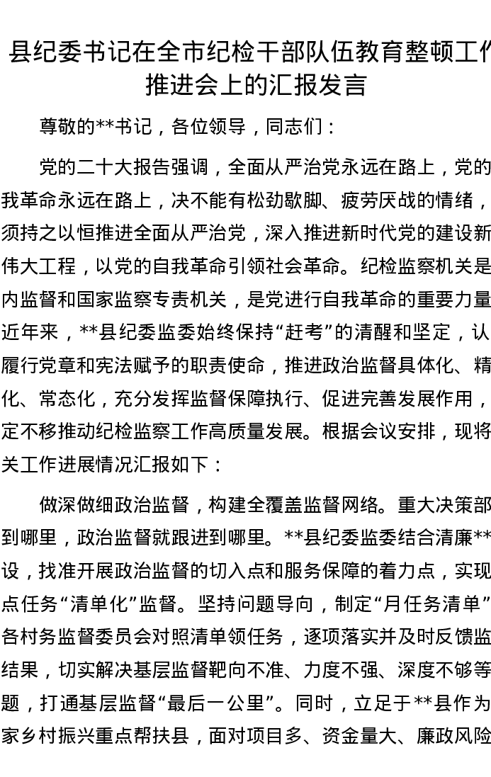 县纪委书记在全市纪检干部队伍教育整顿工作推进会上的汇报发言