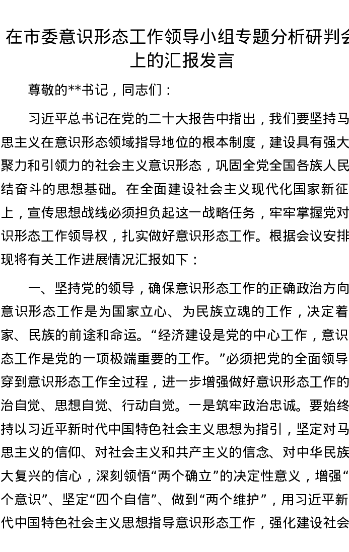 在市委意识形态工作领导小组专题分析研判会上的汇报发言