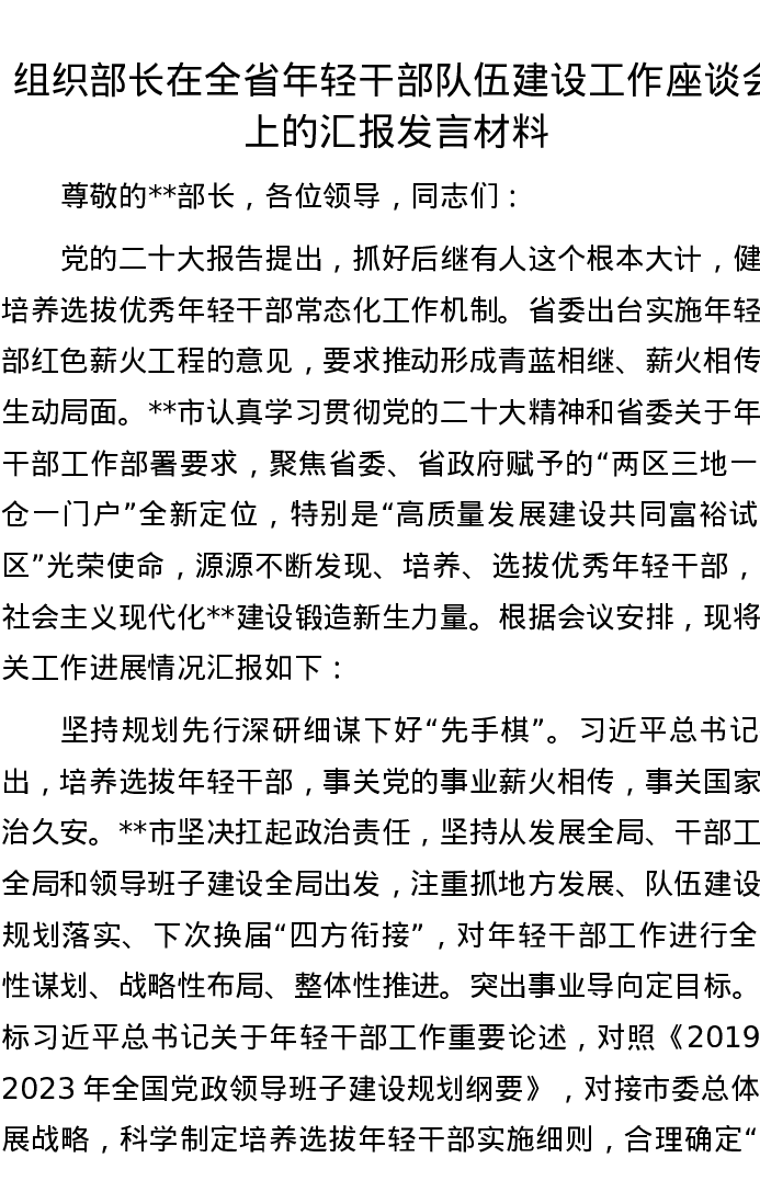 组织部长在全省年轻干部队伍建设工作座谈会上的汇报发言材料