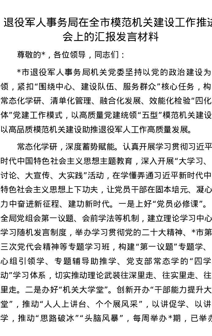 退役军人事务局在全市模范机关建设工作推进会上的汇报发言材料
