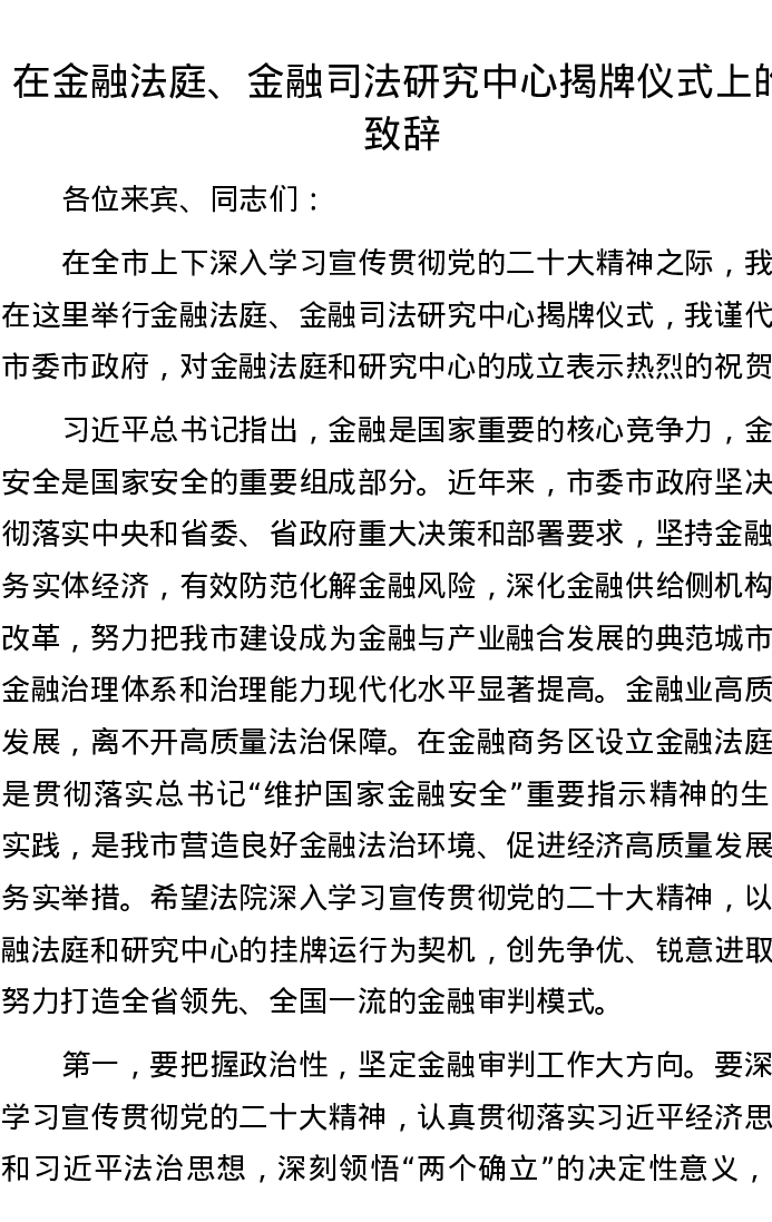 在金融法庭、金融司法研究中心揭牌仪式上的致辞