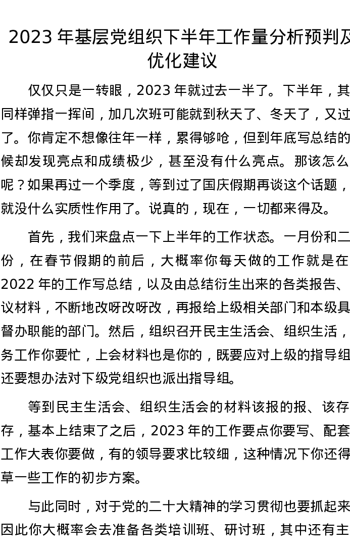 2023年基层党组织下半年工作量分析预判及优化建议