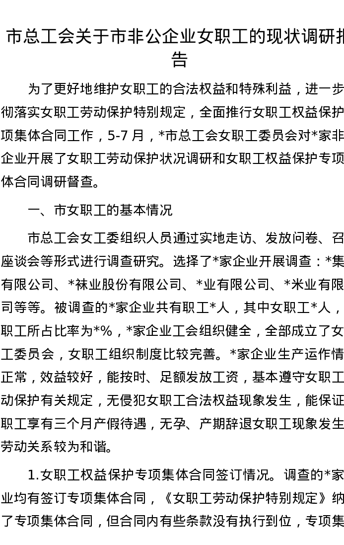 市总工会关于市非公企业女职工的现状调研报告
