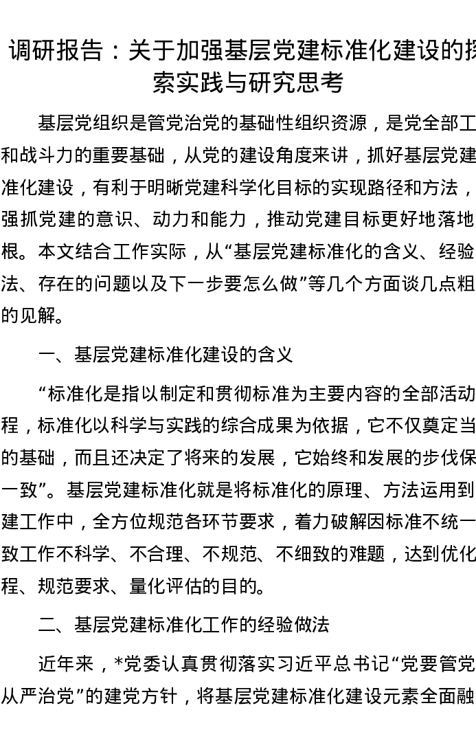 调研报告:关于加强基层党建标准化建设的探索实践与研究思考
