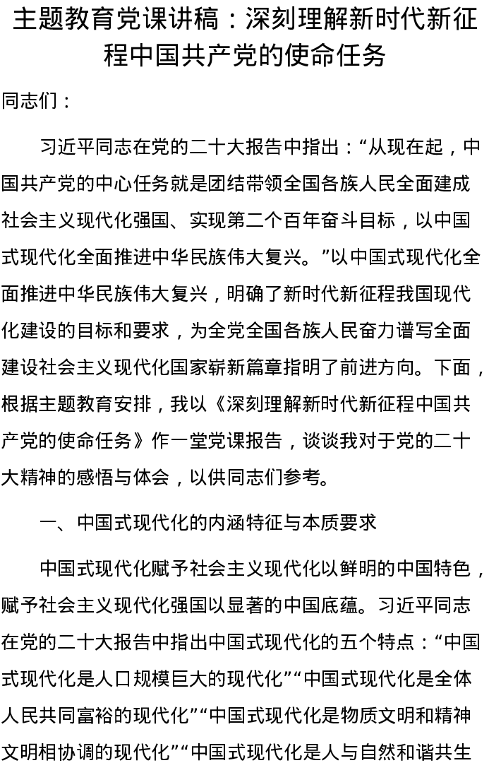 主题教育党课讲稿:深刻理解新时代新征程中国共产党的使命任务(特色社会主义思想)