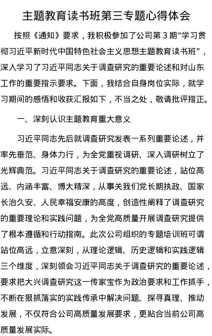 主题教育读书班第三专题心得体会(特色社会主义思想)