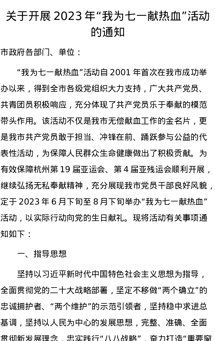 关于开展2023年“我为七一献热血”活动的通知(特色社会主义思想)