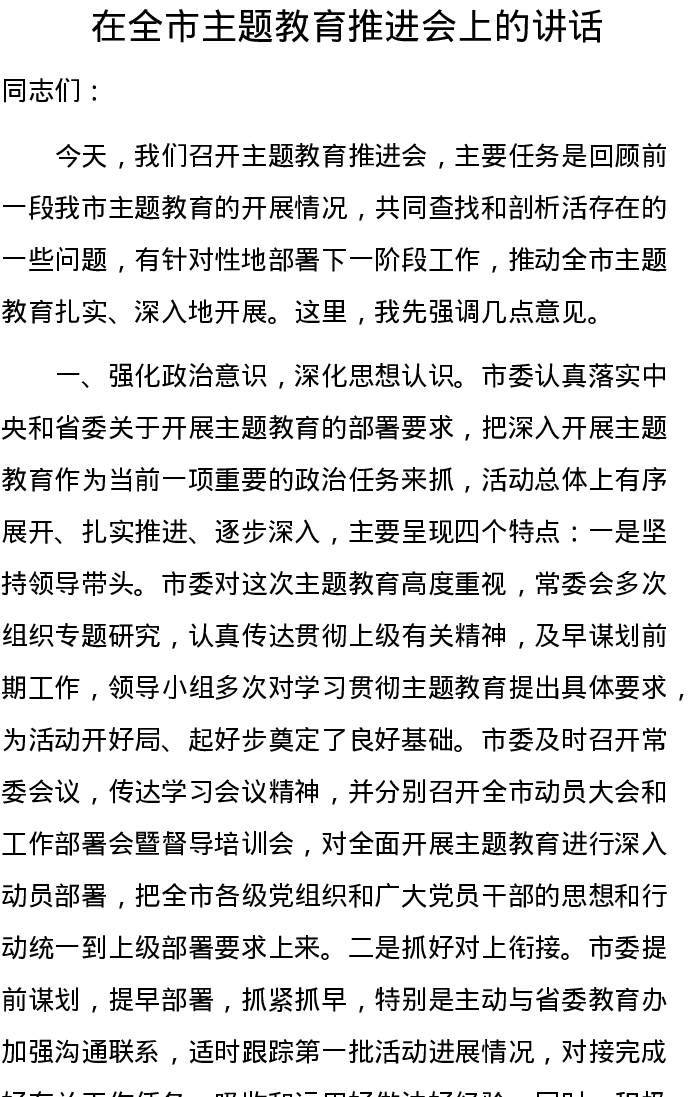 在全市主题教育推进会上的讲话(特色社会主义思想)