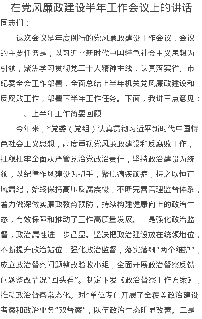 在党风廉政建设半年工作会议上的讲话