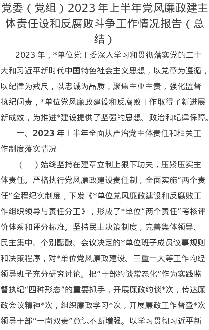 党委(党组)2023年上半年党风廉政建主体责任设和反腐败斗争工作情况报告(总结)