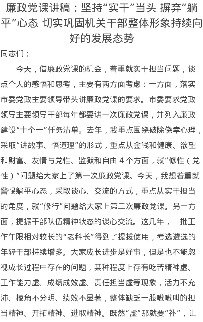 廉政党课讲稿 坚持实干当头摒弃躺平心态切实巩固机关干部整体形象持续向好的发展态势
