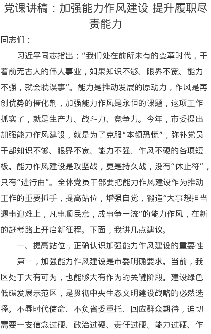 党课讲稿 加强能力作风建设 提升履职尽责能力