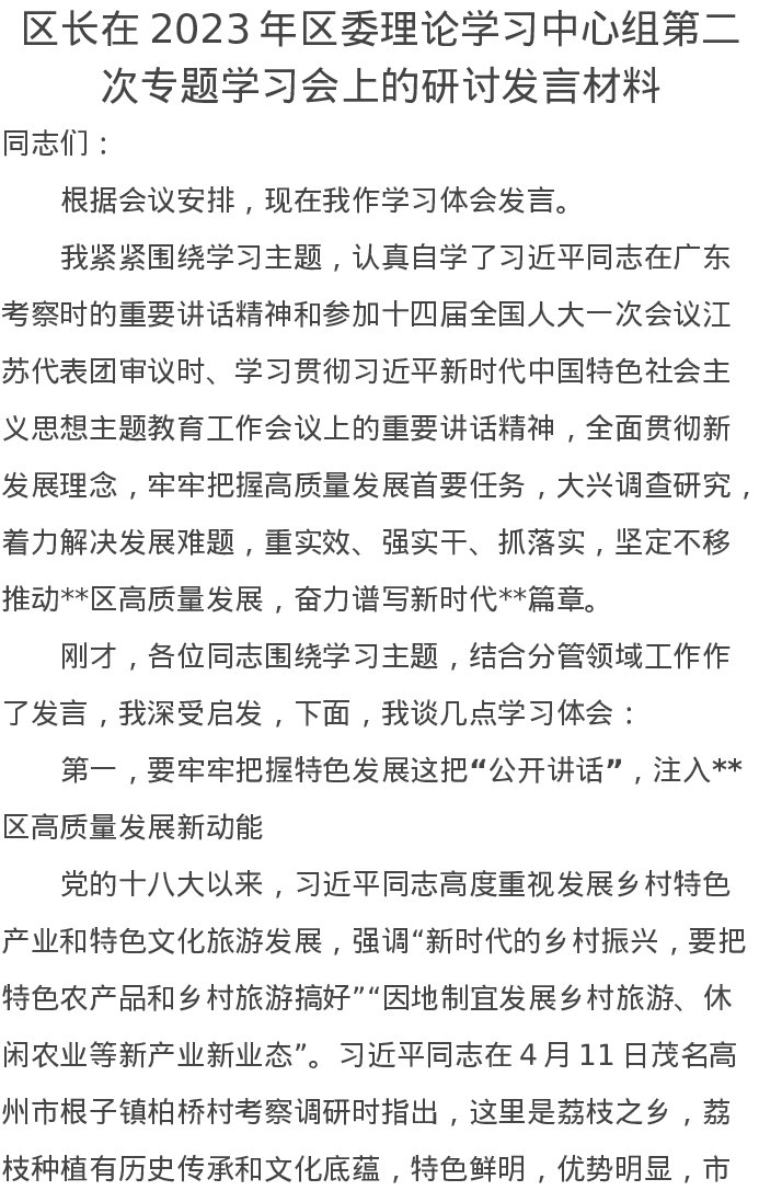 区长在2023年区委理论学习中心组第二次专题学习会上的研讨发言材料