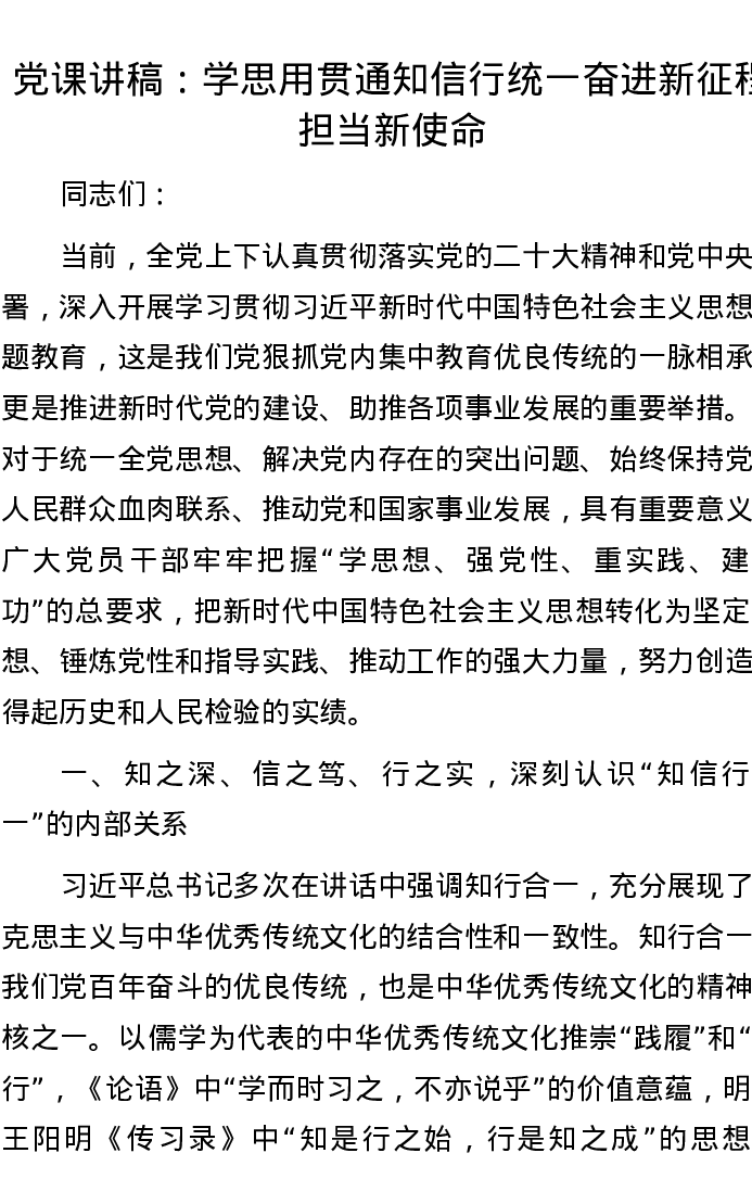 党课讲稿:学思用贯通知信行统一 奋进新征程担当新使命