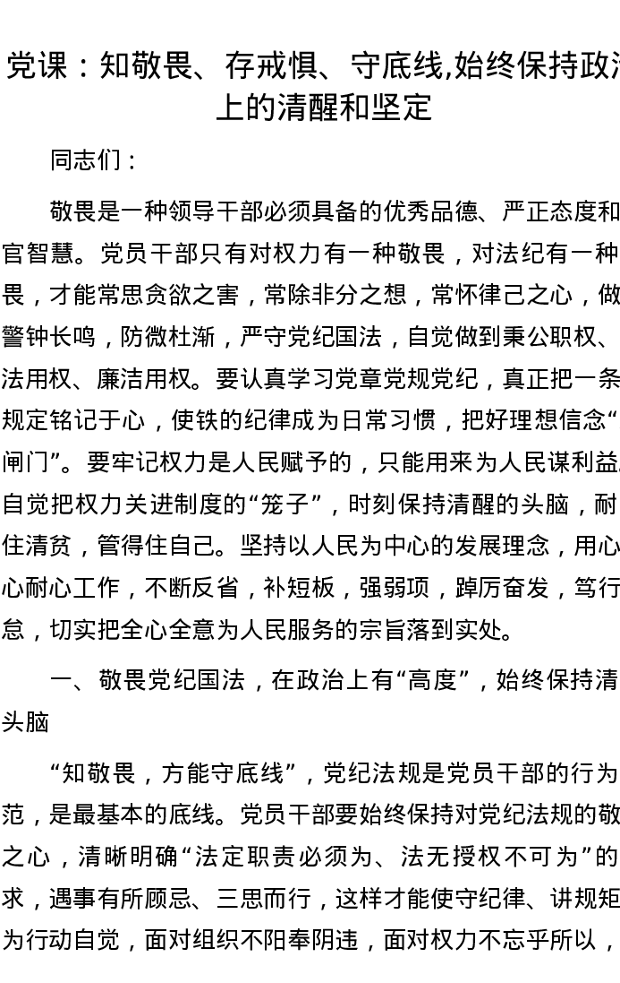 党课:知敬畏、存戒惧、守底线,始终保持政治上的清醒和坚定