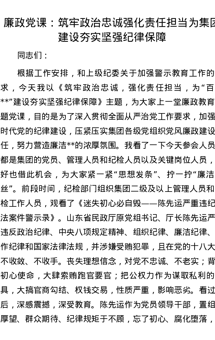 廉政党课:筑牢政治忠诚强化责任担当 为集团建设夯实坚强纪律保障