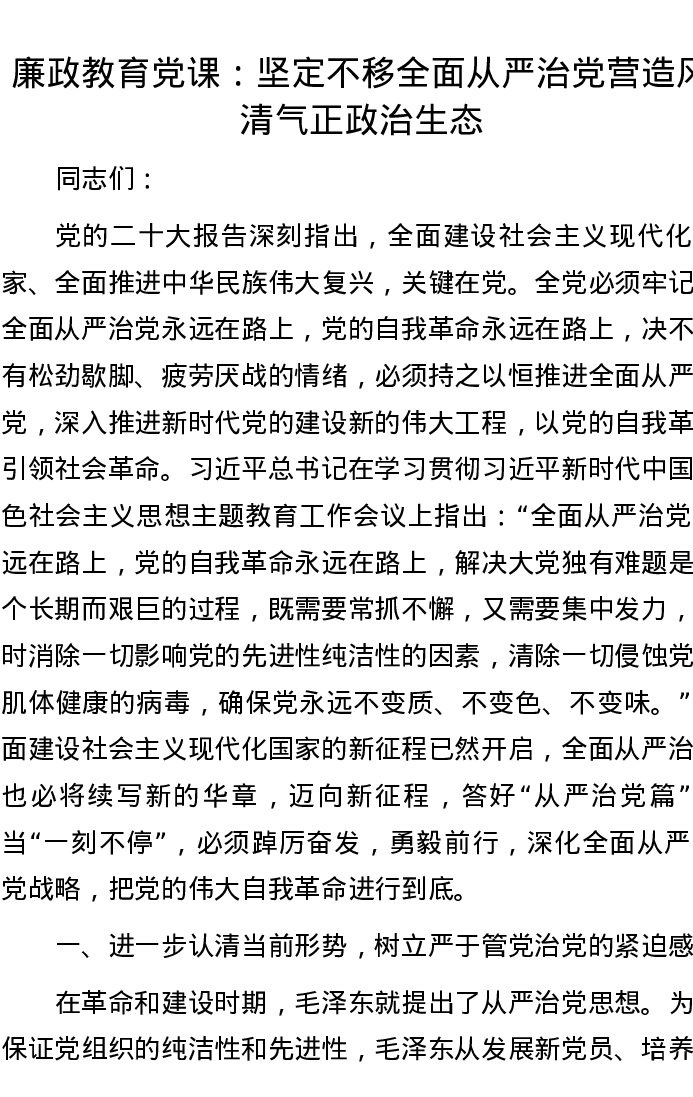 廉政教育党课:坚定不移全面从严治党 营造风清气正政治生态
