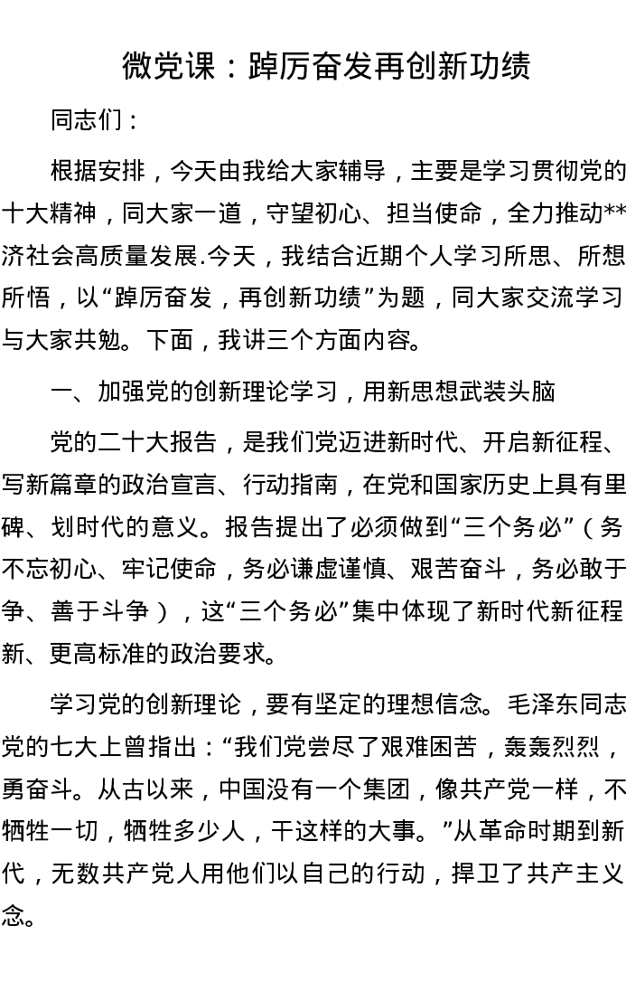 微党课:踔厉奋发 再创新功绩