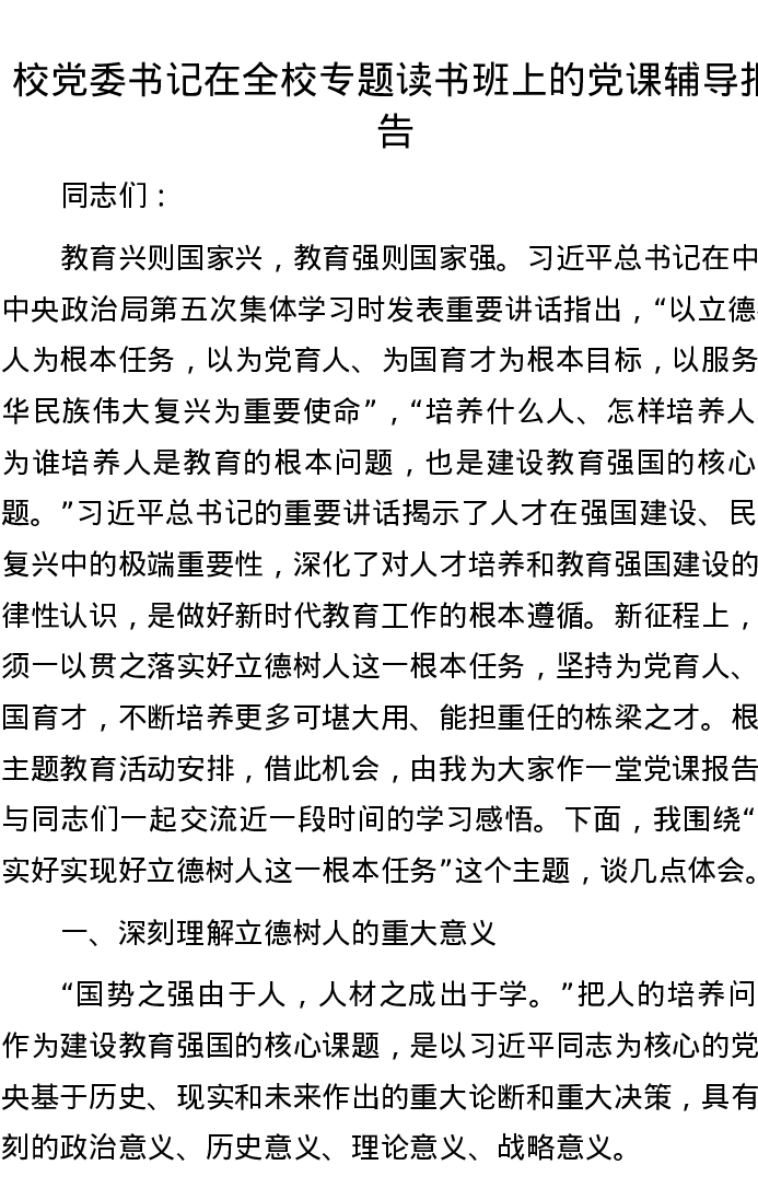 校党委书记在全校专题读书班上的党课辅导报告