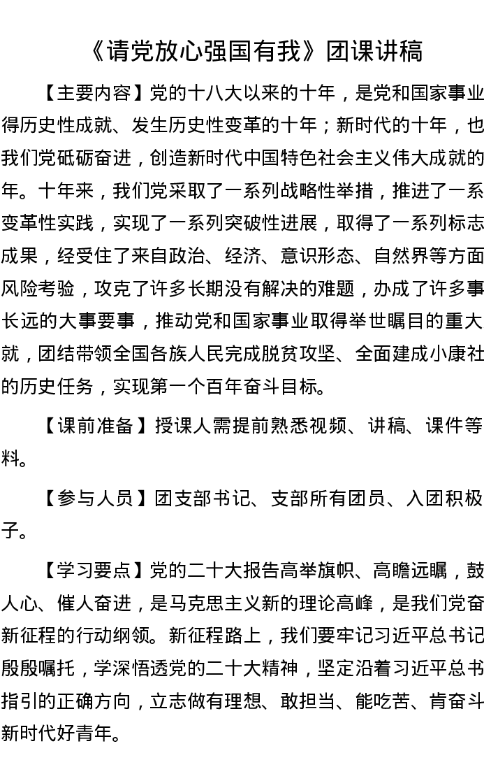 讲稿讲义-《请党放心 强国有我》团课讲稿