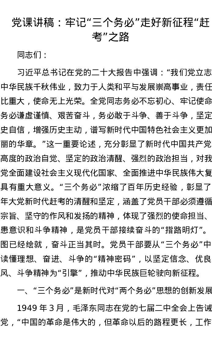 讲稿讲义-党课讲稿:牢记“三个务必” 走好新征程“赶考”之路