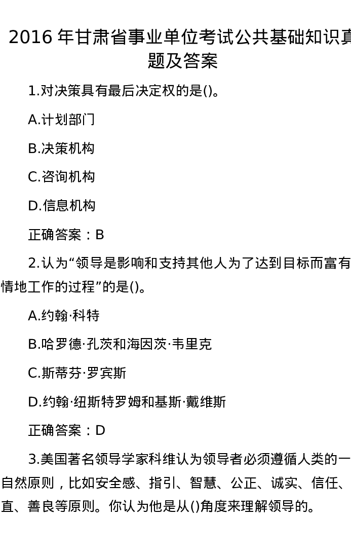 2016年甘肃省事业单位考试公共基础知识真题及答案