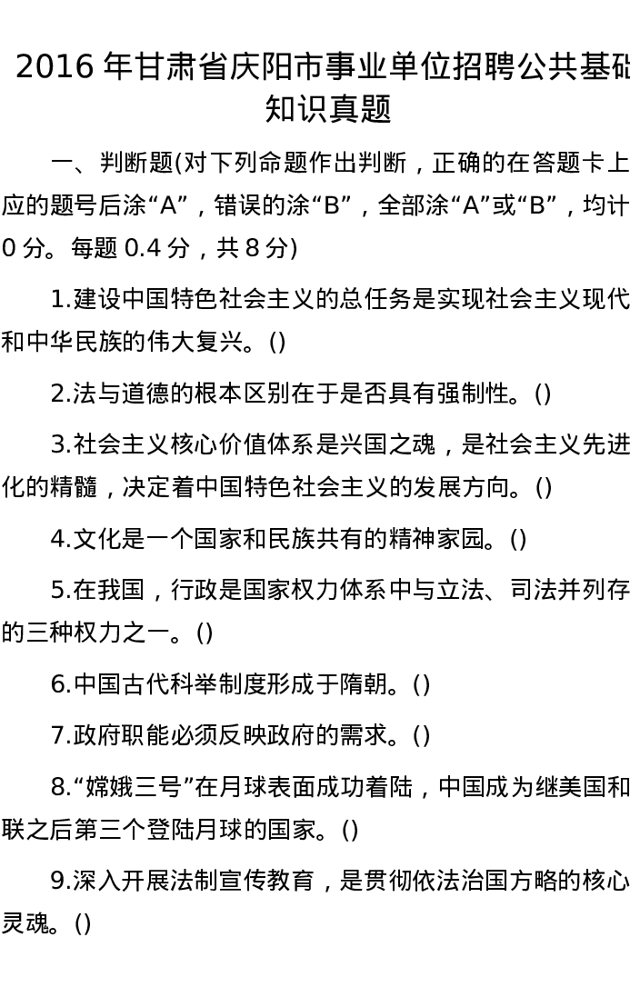 2016年甘肃省庆阳市事业单位招聘公共基础知识真题