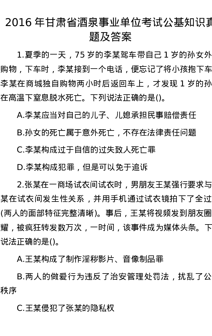 2016年甘肃省酒泉事业单位考试公基知识真题及答案